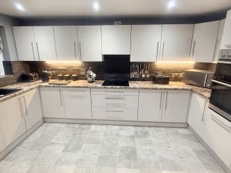 A large modern kitchen fitted with plenty of worktop space and storage, with tile splashbacks and flooring, integrated appliances including an oven and hob, fridge freezer and complimentary breakfast bar.