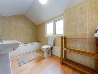 The family bathroom is fitted with a white suite comprising a panelled bath, a pedestal wash hand basin, and a close-coupled WC suite. The room features a side-facing window, vinyl flooring, and fully tiled walls. A radiator (TRV) and a ceiling light point complete the space.