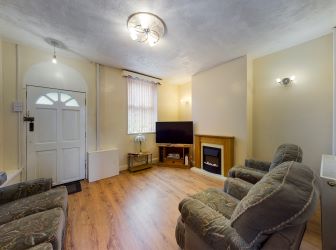 A welcoming front-facing room with a double-glazed window offering natural light. This room is fitted with laminate flooring, two wall light points, two ceiling light points, and a radiator with thermostatic valve (TRV). The feature fire surround with an electric fire adds warmth and charm. The room also houses the concealed gas and electric meters. A door leads to the second reception room.