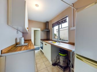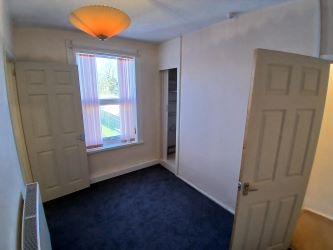 The second reception room offers additional living space, with stairs rising to the first floor accommodation and steps down into the basement cellar, currently via a trapdoor. It features a rear-facing window and door, as well as a wall-mounted electric fire, providing a cozy ambiance. There are useful built-in cupboards for additional storage, along with a radiator (TRV) and a ceiling light point. Recessed shelving provides further storage potential. The kitchen is also accessed from this room.