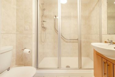 Shower Room: Fully tiled with a walk-in bath, vanity sink, heated towel rail, and storage.