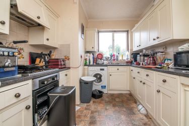 Kitchen – Fitted with wall and base units, 4-ring gas hob, oven, and space for appliances. Door leading to the rear garden.