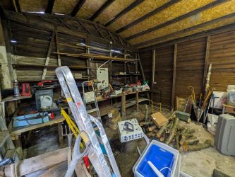 To the front is a driveway providing off-road parking for several vehicles and access to the detached garage. The rear garden features a large lawn, patio area, garden shed, and outbuilding with power.